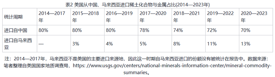 首先,为莱纳斯稀土加工厂保驾护航。马来西亚是中国以外少数能够进行稀土冶炼加工的国家。2008年,澳大利亚矿产企业莱纳斯集团获得了在彭亨州关丹格宾工业区进行稀土加工的许可。随着莱纳斯稀土加工厂投入运营,马来西亚成为了中国之外重要的稀土加工基地。由于莱纳斯所进行的“裂解与浸出”工序将产生放射性废料,而莱纳斯未采取任何保障措施来处理放射性废料,莱纳斯加工厂一经成立便遭到马来西亚民间的强烈反对。但是,马来西亚政府在安抚公众情绪之余,仍然变相纵容并实际支持莱纳斯。马哈蒂尔所领导的“希望联盟”在竞选期间主张关闭莱纳斯加工厂,但在上台后改变了态度。马哈蒂尔在接受记者采访时解释说,马来西亚如果赶走莱纳斯,将不利于吸引国外投资。(60)在取得莱纳斯未来五年内将“裂解与浸出”工序移出马来西亚的承诺后,马来西亚政府同意为莱纳斯更新执照。(61)安瓦尔在野时期也支持关闭莱纳斯,但在成为总理后,对莱纳斯采取了更为务实的做法。2023年5月,安瓦尔确认政府已同意莱纳斯继续经营六个月。(62)10月,安瓦尔内阁进一步宣布继续延长莱纳斯的运营执照至2026年3月。(63)在获得了安瓦尔内阁的支持后,莱纳斯发表声明,强调莱纳斯对马来西亚稀土产业的重要性,认为“稀土行业为马来西亚的经济增长提供了许多机会,马来西亚之所以能引领这一行业,是因为莱纳斯在这里。我们是中国以外最大的稀土分离生产商,这使马来西亚在全球占据了重要地位。”(64)莱纳斯对马来西亚的投资使马来西亚成为了中国以外重要的稀土加工基地。自2015年起,在马来西亚加工生产的稀土化合物与金属成为美国的主要进口来源,且其所占比重呈明显上升态势。马来西亚在2018—2021年期间成为仅次于中国的美国第二大稀土化合物与金属进口来源国,而美国自中国进口的稀土化合物与金属比重相反呈缓慢下降趋势(如表2)。同时,莱纳斯决定继续追加投资,承诺要在马来西亚生产重稀土,打破中国对全球重稀土的长期主导。
