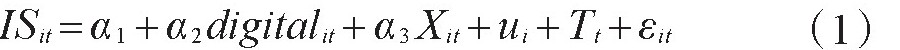 本文首先利用模型(1)验证了数字经济对产业结构的影响,回归结果参见表3。第(1)列和第(2)列是以产业结构高级化为被解释变量,以数字经济发展水平digitalit为解释变量的回归结果,其中第(1)列仅控制了固定效应,第(2)列控制了固定效应和控制变量。第(3)列和第(4)列是以产业结构合理化为被解释变量,同样以数字经济发展水平digitalit为解释变量的回归结果,其中第(3)列仅控制了固定效应,第(4)列控制了固定效应和控制变量。结果显示,digitalit回归系数均显著为正,即数字经济可以促进产业结构的高级化和合理化。究其背后的作用机制,如前所述,数字经济可能通过提高生产效率、促进创新发展、催生新商业模式和推进外贸增长等促进产业结构升级。