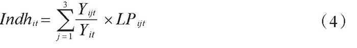 被解释变量ISit代表产业结构高级化和产业结构合理化。其中,产业结构高级化反映的是根据经济发展的历史和逻辑序列从低水平状态向高水平状态顺次演进的过程,主要是用三大产业产值占生产总值比例的演进过程Indhit衡量。(4)计算公式如下: