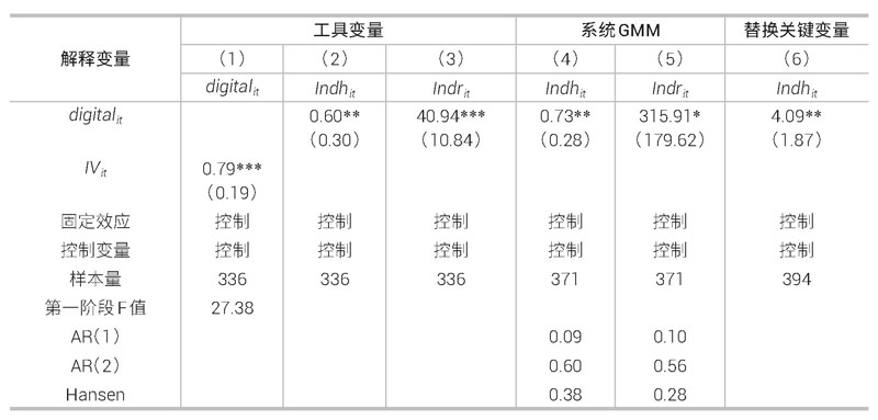 使用工具变量、系统广义矩估计(SystemGMM)和替换关键变量的方法检验稳健性。面临可能的反向因果关系,即产业结构的变化或许会反过来影响数字经济的发展。本文选择拉美各国1990年的固定电话数量作为数字经济的工具变量,因为数字经济依赖的基础设施往往是历史使用习惯的延续发展,即历史上固定电话数量普及率较高的地区也有可能是当今数字经济发展水平较高的地区,加上历史上固定电话数量对如今的产业结构影响较小,因此1990年的固定电话数量能够同时满足工具变量的相关性和内生性要求。(1)但是,该工具变量不随时间变化,不能满足面板数据固定效应模型的要求,因此采用上一年全国互联网的用户数与其交乘,作为数字经济的工具变量。第一阶段的回归结果参见表4第(1)列,回归系数显著为正,F值为27.38,工具变量有效。参见表4第(2)列和第(3)列可以看到,使用工具变量后回归结果依然稳健。