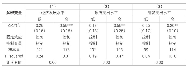 根据经济发展水平、政府支出水平和研发支出水平的不同对样本进行细分,揭示了数字经济对产业结构升级影响的异质性,回归结果参见表5。(2)