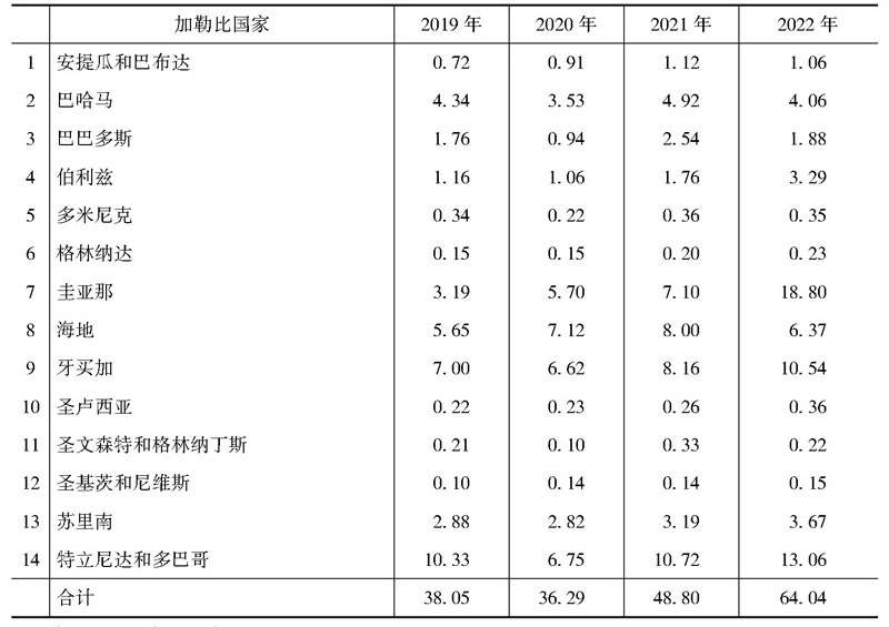 表1 2019~2022年中国和加勒比国家进出口总额